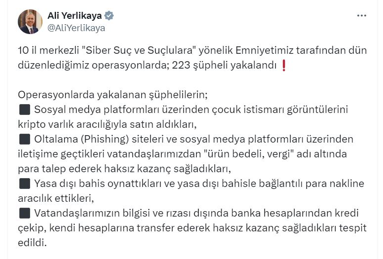 Bakan Yerlikaya, sosyal medya hesabından yaptığı açıklamada, cumhuriyet başsavcılıkları ile Emniyet Genel Müdürlüğü Siber Suçlarla Mücadele Daire Başkanlığı koordinesinde, dün siber suç ve suçlulara yönelik 10 il merkezli 31 ilde düzenlenen operasyonlarda 223 şüphelinin yakalandığını belirtti. Yerlikaya, "Operasyonlarda yakalanan şüphelilerin; sosyal medya platformları üzerinden çocuk istismarı görüntülerini kripto varlık aracılığıyla satın aldıkları, oltalama (phishing) siteleri ve sosyal medya platformları üzerinden iletişime geçtikleri vatandaşlarımızdan 'ürün bedeli, vergi' adı altında para talep ederek haksız kazanç sağladıkları, yasa dışı bahis oynattıkları ve yasa dışı bahisle bağlantılı para nakline aracılık ettikleri, vatandaşlarımızın bilgisi ve rızası dışında banka hesaplarından kredi çekip, kendi hesaplarına transfer ederek haksız kazanç sağladıkları tespit edildi" dedi.