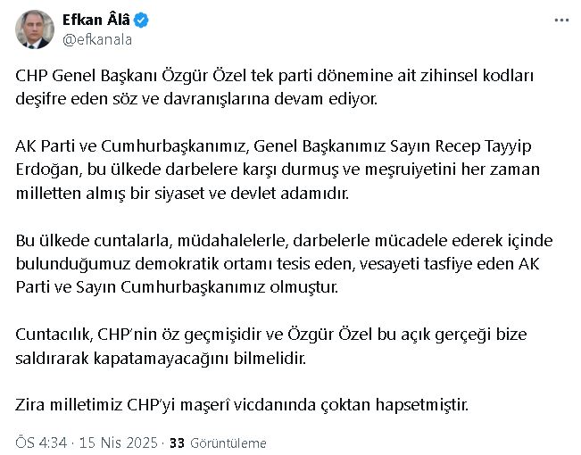 AK Parti'li Efkan Ala, sosyal medya hesabından yaptığı açıklamada, "CHP Genel Başkanı Özgür Özel tek parti dönemine ait zihinsel kodları deşifre eden söz ve davranışlarına devam ediyor. AK Parti ve Cumhurbaşkanımız, Genel Başkanımız Sayın Recep Tayyip Erdoğan, bu ülkede darbelere karşı durmuş ve meşruiyetini her zaman milletten almış bir siyaset ve devlet adamıdır. Bu ülkede cuntalarla, müdahalelerle, darbelerle mücadele ederek içinde bulunduğumuz demokratik ortamı tesis eden, vesayeti tasfiye eden AK Parti ve Sayın Cumhurbaşkanımız olmuştur. Cuntacılık, CHP'nin öz geçmişidir ve Özgür Özel bu açık gerçeği bize saldırarak kapatamayacağını bilmelidir. Zira milletimiz CHP'yi maşeri vicdanında çoktan hapsetmiştir" dedi.