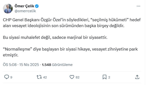 AK Parti'li Ömer Çelik, sosyal medya hesabından açıklama yaptı. Çelik, Özel'in TBMM 'Grup Toplantısı'ndaki sözlerine ilişkin, "CHP Genel Başkanı Özgür Özel’in söyledikleri, 'seçilmiş hükümeti' hedef alan vesayet ideolojisinin son sürümünden başka bir şey değildir. Bu siyasi muhalefet değil, sadece marjinal bir siyasettir. 'Normalleşme' diye başlayan bir siyasi hikaye, vesayet zihniyetine park etmiştir" ifadelerini kullandı.