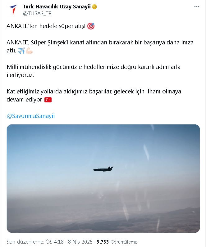 TUSAŞ'ın sosyal medya hesabından ANKA 3'ün test atışı görüntüleri paylaşıldı. Görüntüde, ANKA 3'ün TUSAŞ'ın havadan karaya füzesi ve havadan havaya füzesi Süper Şimşek'i bıraktığı anlar ve hedefin isabetle vurulması yer aldı. Açıklamada, "ANKA 3'ten hedefe süper atış. ANKA 3, Süper Şimşek'i kanat altından bırakarak bir başarıya daha imza attı. Milli mühendislik gücümüzle hedeflerimize doğru kararlı adımlarla ilerliyoruz. Katettiğimiz yollarda aldığımız başarılar, gelecek için ilham olmaya devam ediyor" denildi.
