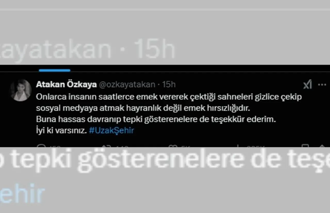 Başrolünde Sinem Ünsal ve Ozan Akbaba'nın rol aldığı Uzak Şehir dizisi, her hafta kendi rekorunu kırmayı başarıyor. Mardin'de çekilen diziye hayranları da yoğun ilgi gösteriyor. Geçtiğimiz aylarda Ozan Akbaba, dizinin sahnelerinin yayınlanmasına tepki gösterirken, bu sefer ise Atakan Özkaya sitem etti.