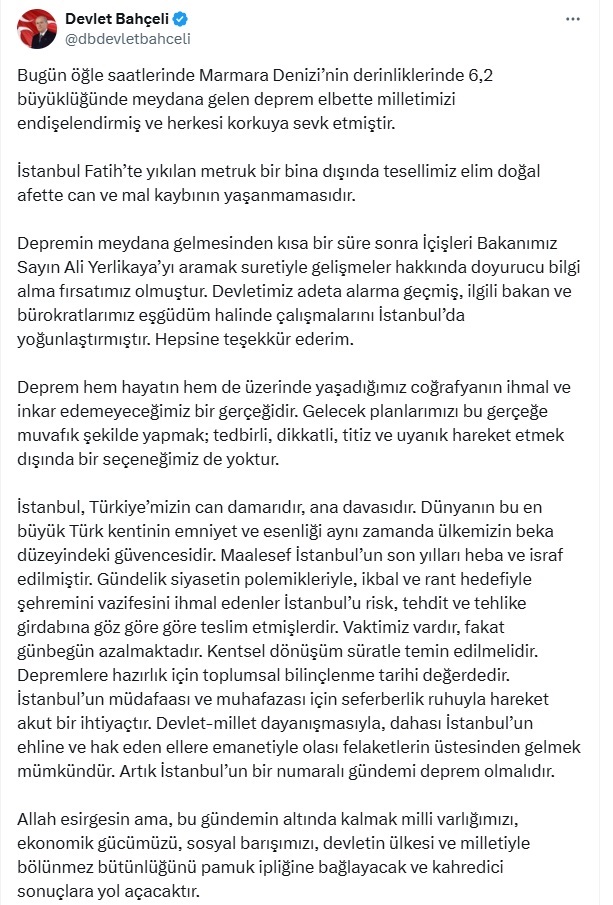 MHP Genel Başkanı Devlet Bahçeli, sosyal medya hesabından İstanbul’da meydana gelen depreme ilişkin açıklamada bulundu. Öğle saatlerinde Marmara Denizi’nin derinliklerinde 6,2 büyüklüğünde meydana gelen depremin milleti endişelendirdiğini ve herkesi korkuya sevk ettiğini kaydeden Bahçeli, "İstanbul Fatih’te yıkılan metruk bir bina dışında tesellimiz elim doğal afette can ve mal kaybının yaşanmamasıdır. Depremin meydana gelmesinden kısa bir süre sonra İçişleri Bakanımız Sayın Ali Yerlikaya’yı aramak suretiyle gelişmeler hakkında doyurucu bilgi alma fırsatımız olmuştur. Devletimiz adeta alarma geçmiş, ilgili bakan ve bürokratlarımız eşgüdüm halinde çalışmalarını İstanbul’da yoğunlaştırmıştır. Hepsine teşekkür ederim" ifadelerini kullandı.