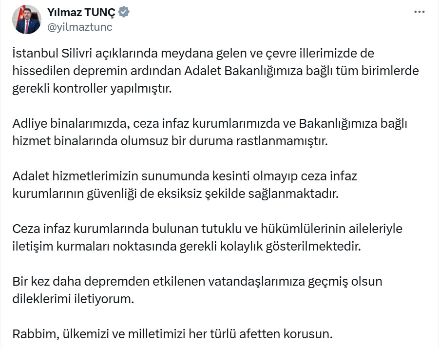 Bakan Tunç, "Adalet hizmetlerimizin sunumunda kesinti olmayıp ceza infaz kurumlarının güvenliği de eksiksiz şekilde sağlanmaktadır. Ceza infaz kurumlarında bulunan tutuklu ve hükümlülerinin aileleriyle iletişim kurmaları noktasında gerekli kolaylık gösterilmektedir. Bir kez daha depremden etkilenen vatandaşlarımıza geçmiş olsun dileklerimi iletiyorum. Rabbim, ülkemizi ve milletimizi her türlü afetten korusun" ifadelerini kullandı.