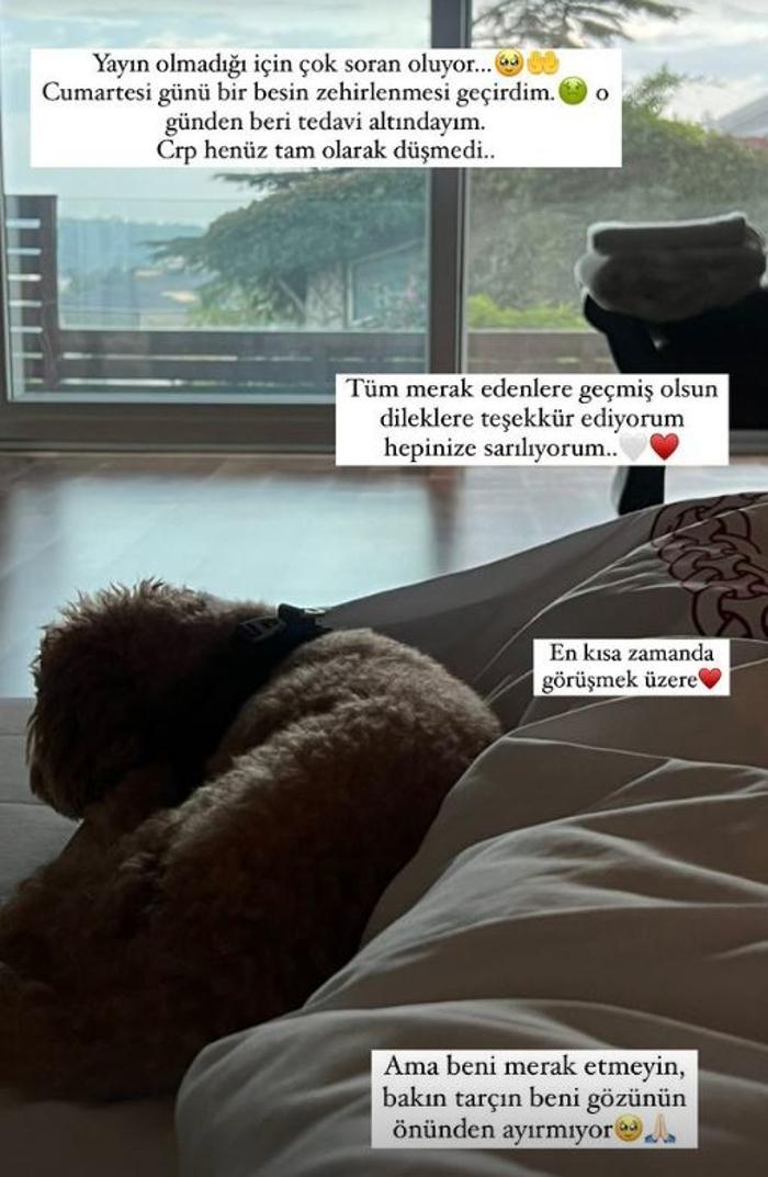 "Yayın olmadığı için çok soran oluyor... Cumartesi günü bir besin zehirlenmesi geçirdim. O günden beri tedavi altındayım. Crp henüz tam olarak düşmedi. Tüm merak edenlere, geçmiş olsun dileklerine teşekkür ediyorum. Hepinize sarılıyorum. En kısa zamanda görüşmek üzere. Ama beni merak etmeyin, bakın Tarçın beni gözünün önünden ayırmıyor."