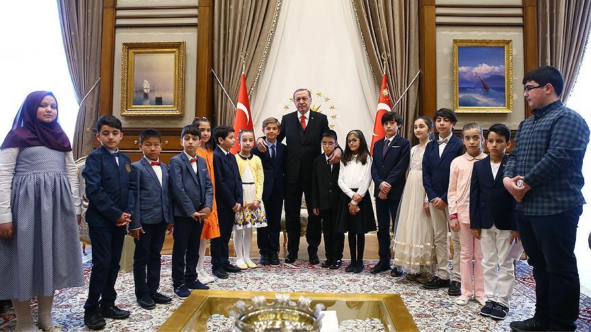 Cumhurbaşkanı Erdoğan, Türkiye Yüzyılı hedefine ulaşana kadar durmayacaklarını ifade ederek, "Gazi Mustafa Kemal ve silah arkadaşları, Milli Mücadele'nin en zor zamanlarında Büyük Millet Meclisi'ni açtılar. Milli iradenin karargahı olan Meclisimiz bundan 105 sene önce büyük umutlarla ve dualarla açıldı. Gazi Meclisimiz, istiklal harbimizi başarıyla yürüterek, ülkemizi işgalden, milletimizi esaretten kurtardı. Cumhuriyet tarihimizin bu önemli günü sizlere hediye edildi. Böylece, egemenliğin sahibinin çocuklar olduğunu tüm dünyaya duyurmuş olduk. 23 Nisan sadece siz çocukların değil, milli iradenin de bayramıdır. Son 23 yılda bu anlayışla, ülkemize, milletimize özellikle de siz çocuklara hizmet etmeye çalıştık. Sizlere daha mutlu, daha müreffeh, her alanda parmakla gösterilen bir ülke teslim etmek için koşturduk. Türkiye'yi çok güzel seviyelere getirdik. İnşallah, çok daha iyi yerlerde olacağız. Türkiye Yüzyılı hedefimize ulaşana kadar durmayacağız. Sizler, büyük bir milletin evlatlarısınız. Sizler, büyük bir ülkenin vatandaşlarısınız. Sizler aynı zamanda, bizim en değerli varlığımızsınız. Bizim için her güldüğünüzde yüzlerinizde açan çiçekleri görmekten daha büyük bir mutluluk kaynağı olamaz. Sizlerin heyecanı, gayreti ve tebessümü ülkemizin en büyük hazinesidir. Gelecekte, bu koltuklarda belki de siz oturacak, bu görevlerde belki de sizler bulunacaksınız. Ailelerinizle birlikte milletimizin de kıvanç kaynağı olacaksınız. Eğitimde, bilimde, sanatta, ticarette ve diğer alanlarda başarıdan başarıya koşacağınıza tüm kalbimle inanıyorum. Sizlere güveniyorum, sizleri seviyorum. Ziyaretiniz için her birinize teşekkür ediyorum" diye konuştu.