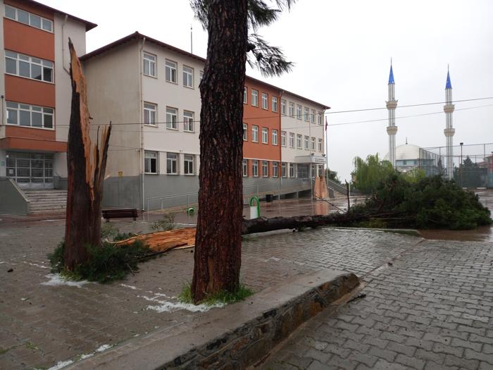 Ya-tu Otomotiv Hürriyet İlkokulu ve Ortaokulu bahçesinde ağaç şiddetli rüzgar nedeniyle devrildi.