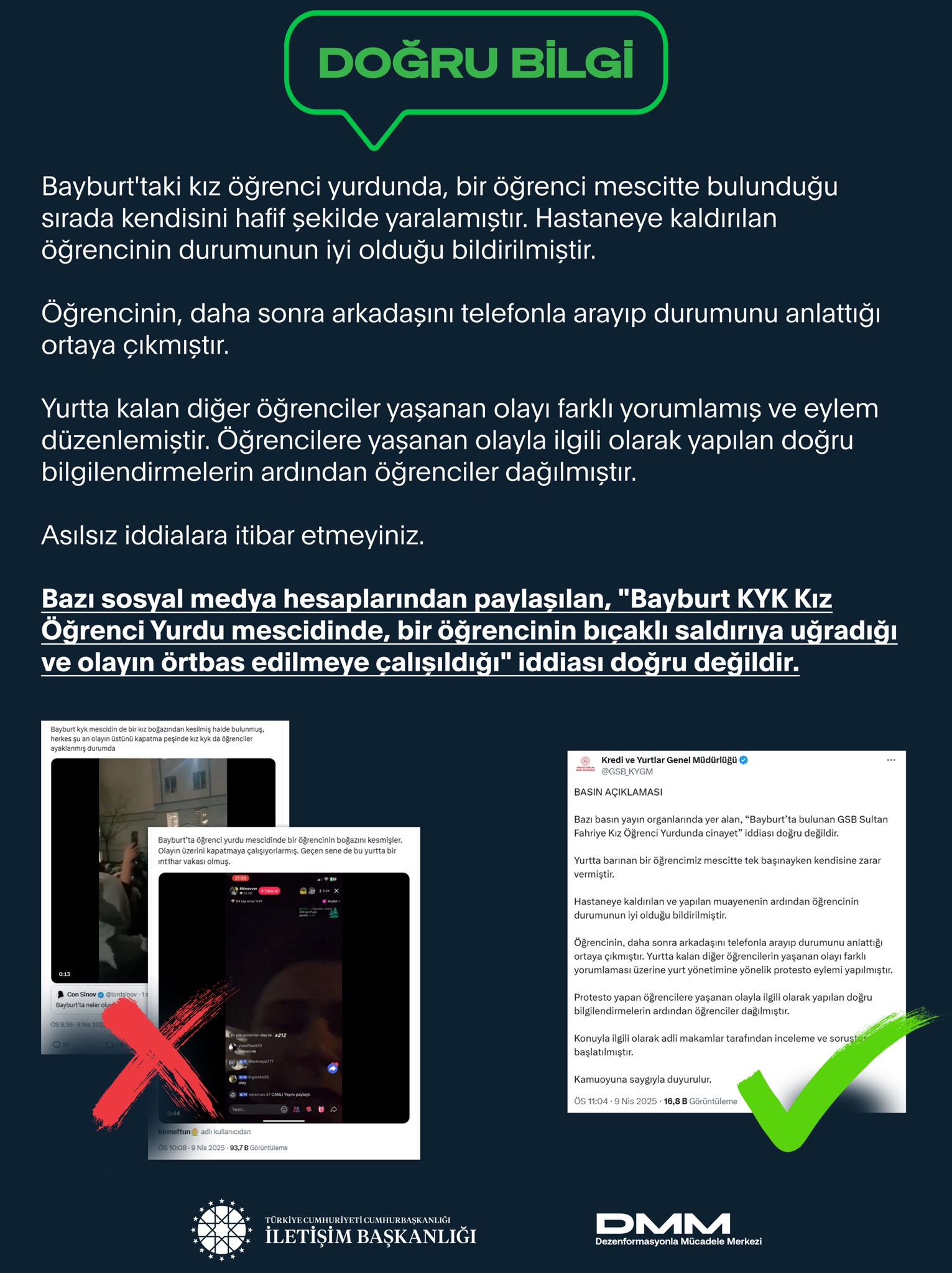 DMM'nin sosyal medya hesabından yapılan paylaşımda, "Bazı sosyal medya hesaplarından paylaşılan, 'Bayburt KYK Kız Öğrenci Yurdu mescidinde, bir öğrencinin bıçaklı saldırıya uğradığı ve olayın örtbas edilmeye çalışıldığı' iddiası doğru değildir. Bayburt'taki kız öğrenci yurdunda, bir öğrenci mescitte bulunduğu sırada kendisini hafif şekilde yaralamıştır. Hastaneye kaldırılan öğrencinin durumunun iyi olduğu bildirilmiştir. Öğrencinin, daha sonra arkadaşını telefonla arayıp durumunu anlattığı ortaya çıkmıştır. Yurtta kalan diğer öğrenciler yaşanan olayı farklı yorumlamış ve eylem düzenlemiştir. Öğrencilere yaşanan olayla ilgili olarak yapılan doğru bilgilendirmelerin ardından öğrenciler dağılmıştır. Asılsız iddialara itibar etmeyiniz" ifadelerine yer verildi.