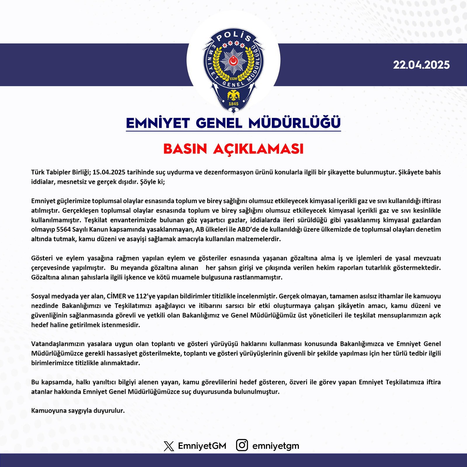 EGM’nin sosyal medya hesabından yapılan yazılı açıklamada, “Türk Tabipler Birliği; 15 Nisan 2025 tarihinde suç uydurma ve dezenformasyon ürünü konularla ilgili bir şikayette bulunmuştur. Şikayete bahis iddialar, mesnetsiz ve gerçek dışıdır. Şöyle ki; Emniyet güçlerimize toplumsal olaylar esnasında toplum ve birey sağlığını olumsuz etkileyecek kimyasal içerikli gaz ve sıvı kullanıldığı iftirası atılmıştır. Gerçekleşen toplumsal olaylar esnasında toplum ve birey sağlığını olumsuz etkileyecek kimyasal içerikli gaz ve sıvı kesinlikle kullanılmamıştır. Teşkilat envanterimizde bulunan göz yaşartıcı gazlar, iddialarda ileri sürüldüğü gibi yasaklanmış kimyasal gazlardan olmayıp 5564 Sayılı Kanun kapsamında yasaklanmayan, AB ülkeleri ile ABD'de de kullanıldığı üzere ülkemizde de toplumsal olayları denetim altında tutmak, kamu düzeni ve asayişi sağlamak amacıyla kullanılan malzemelerdir. Gösteri ve eylem yasağına rağmen yapılan eylem ve gösteriler esnasında yaşanan gözaltına alma iş ve işlemleri de yasal mevzuatı çerçevesinde yapılmıştır. Bu meyanda gözaltına alınan her şahsın girişi ve çıkışında verilen hekim raporları tutarlılık göstermektedir. Gözaltına alınan şahıslarla ilgili işkence ve kötü muamele bulgusuna rastlanmamıştır” denildi.