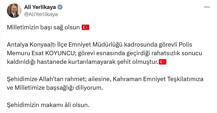 Bakan Yerlikaya, sosyal medya hesabından yaptığı açıklamada, "Milletimizin başı sağ olsun. Antalya Konyaaltı İlçe Emniyet Müdürlüğü kadrosunda görevli polis memuru Esat Koyuncu; görevi esnasında geçirdiği rahatsızlık sonucu kaldırıldığı hastanede kurtarılamayarak şehit olmuştur. Şehidimize Allah'tan rahmet; ailesine, kahraman Emniyet Teşkilatımıza ve milletimize başsağlığı diliyorum. Şehidimizin makamı ali olsun" dedi.