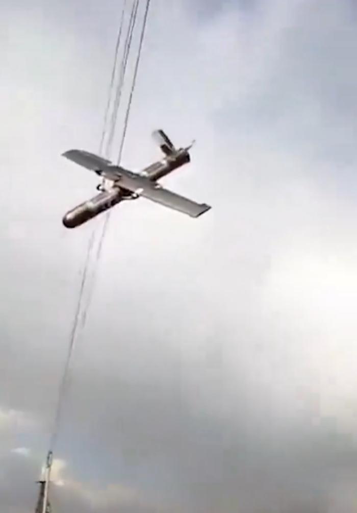 Cep telefonu kameralarına yansıyan görüntülerde, İran'dan İsrail'e yola çıkan kamikaze İHA'sının, elektrik tellerine takılarak etkisiz hale geldiği görüldü.