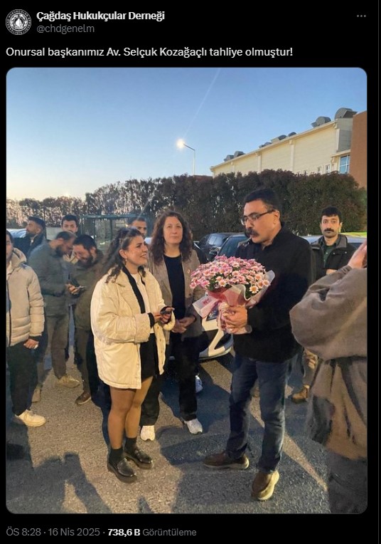 Silivri'deki Marmara Ceza İnfaz Kurumu'nda 2017'den bu yana 'DHKP/C Terör Örgütüne Üye Olmak' suçundan tutuklu olan ÇHD Onursal Genel Başkanı Selçuk Kozağaçlı, bugün akşam saatlerinde tahliye edildi. Kozağaçlı'nın tahliyesi ÇHD'nin sosyal medya hesabından, "Onursal başkanımız Av. Selçuk Kozağaçlı tahliye olmuştur" notu ile duyuruldu. Paylaşılan videoda, cezaevinin önünde bekleyenlerin Kozağaçlı’ya çiçek verdiği görüldü.