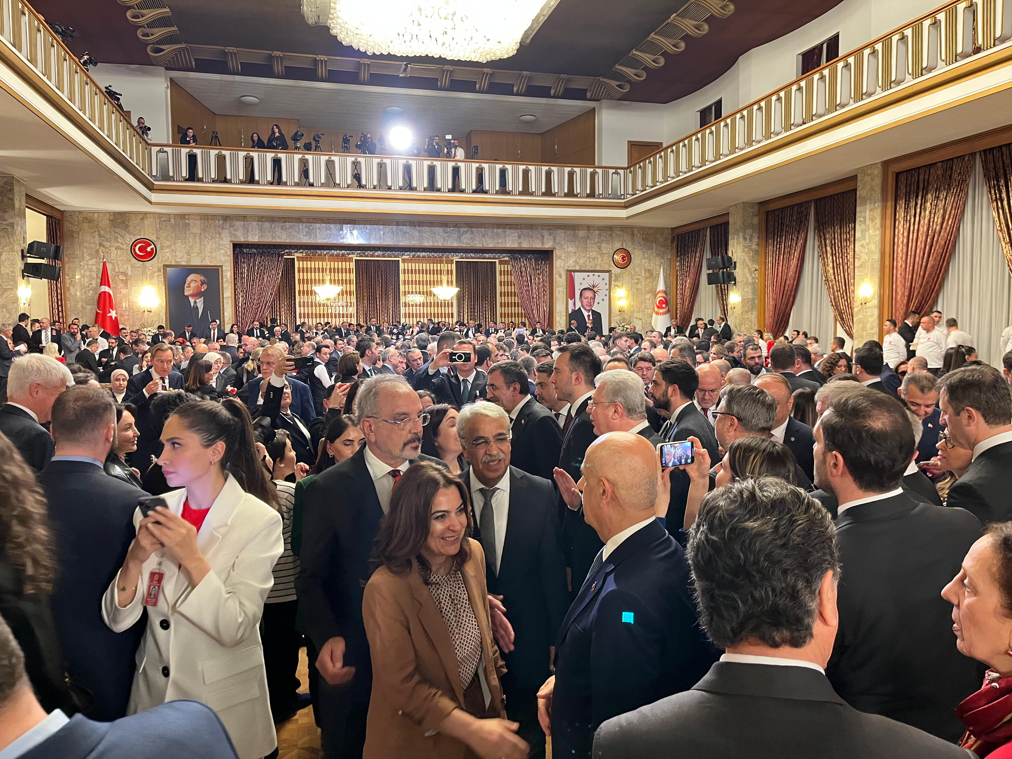 Resepsiyonda İYİ Parti Genel Başkanı Müsavat Dervişoğlu, DEVA Partisi Genel Başkanı Ali Babacan ve DEM Parti heyeti sohbet etti. Ayrıca MHP heyeti de DEM Parti heyeti ile selamlaştı.