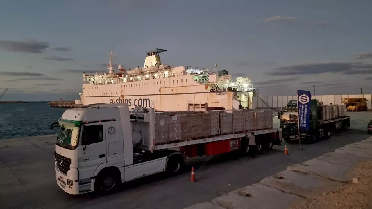 Türkiye'nin 17. "İyilik Gemisi"nden indirilen insani yardım malzemelerinin bir kısmını taşıyan 25 tır, Refah Sınır Kapısı'na doğru yola çıktı.