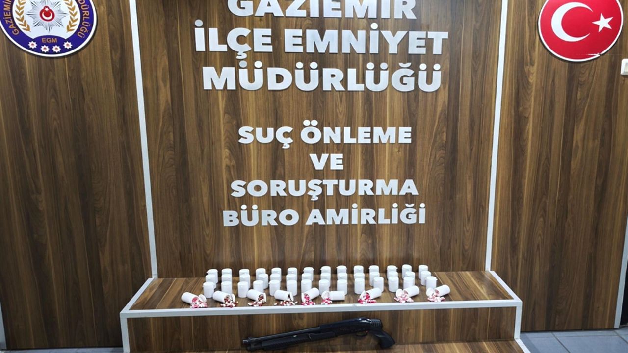 Gaziemir Suç Önleme ve Soruşturma Büro Amirliği ve Devriye Ekipler Amirliği ekipleri, uyuşturucu satanlara yönelik çalışma yaptı. Uyuşturucu sattığı belirlenen Ö.Ş.'nin Emrez Mahallesi'ndeki evine bu sabah operasyon düzenlendi. Evde yapılan aramada 51 kutu içerisinde 2 bin 550 adet sentetik ecza hap ile 1 ruhsatsız pompalı tüfek ele geçirildi. Gözaltına alınan şüphelinin polisteki işlemlerinin sürdüğü bildirildi