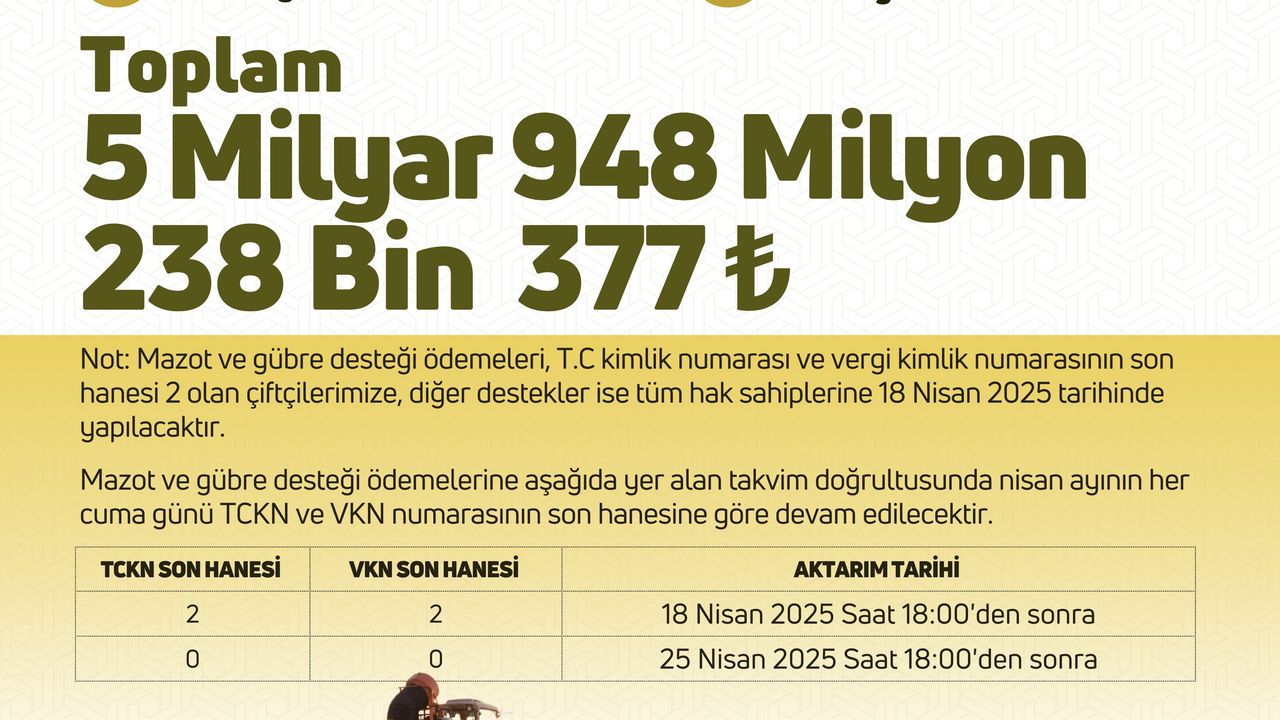Mazot ve gübre destek ödemeleri, çiftçilerin T.C. kimlik numarası ve vergi kimlik numarası son hanelerine göre kademeli olarak gerçekleştirilecek. İlk aşamada, T.C. kimlik numarası ve vergi kimlik numarası son hanesi '2' olan çiftçilere ödemeler 18 Nisan 2025 Cuma günü saat 18.00'den sonra, son hanesi '0' olanlara ise 25 Nisan 2025 Cuma günü saat 18.00'den sonra yapılacak.
