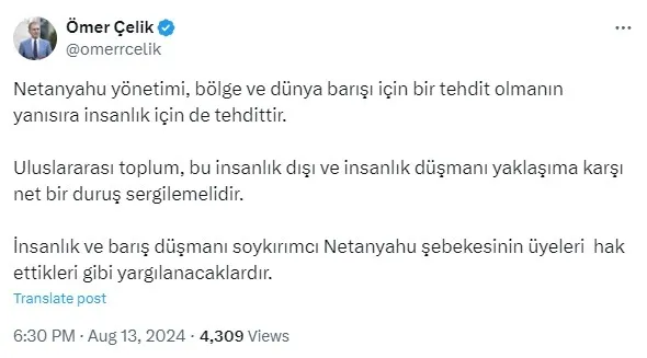 Uluslararası toplumu söz konusu insanlık dışı ve insanlık düşmanı yaklaşıma karşı net bir duruş sergilemeye davet eden Ömer Çelik, Siyonist katil Netanyahu şebekesinin üyelerinin hak ettikleri gibi yargılanacaklarını kaydetti.