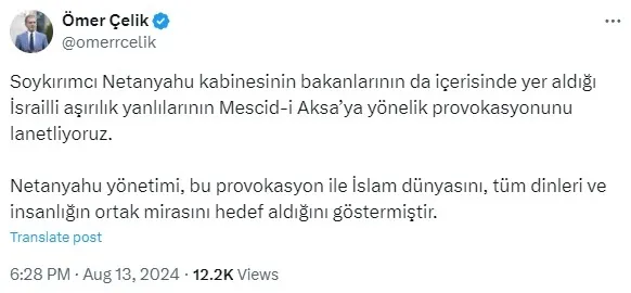 X hesabından paylaşımda bulunan Çelik, işgalcilerin Mescid-i Aksa'ya yönelik provokasyonunu lanetledi.