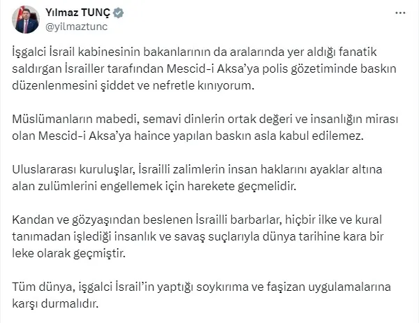 Adalet Bakanı Yılmaz Tunç, İsrailler tarafından Mescid-i Aksa'ya polis gözetiminde baskın düzenlenmesini kınayarak, "Müslümanların mabedi, semavi dinlerin ortak değeri ve insanlığın mirası olan Mescid-i Aksa'ya haince yapılan baskın asla kabul edilemez." ifadesini kullandı.