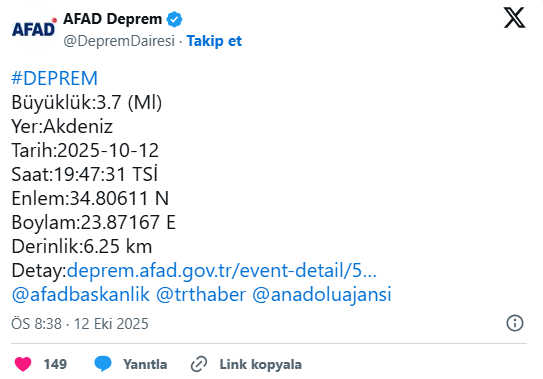 Afet ve Acil Durum Yönetimi Başkanlığı (AFAD), Akdeniz açıklarında 3.7 büyüklüğünde bir depremin meydana geldiğini açıkladı. Depremin saat 19.47’de kaydedildiği, merkez üssünün Akdeniz açıkları olduğu ve yerin 6.25 kilometre derinliğinde gerçekleştiği belirtildi.