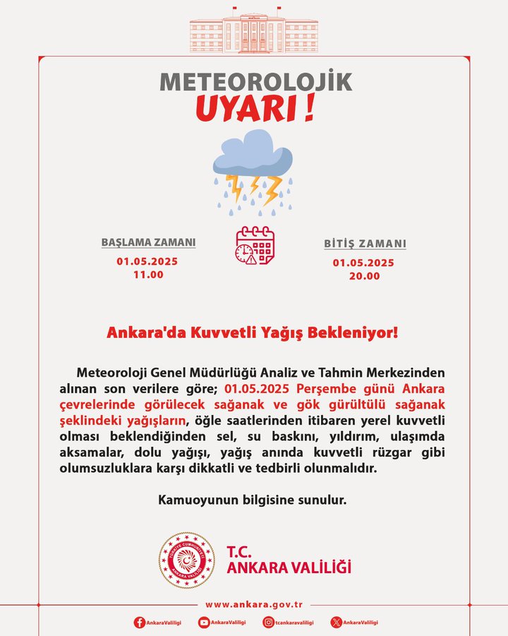 Valiliğin sosyal medya hesabından yapılan açıklamada, “Meteoroloji Genel Müdürlüğü Analiz ve Tahmin Merkezinden alınan son verilere göre; 1 Mayıs 2025 Perşembe günü Ankara çevrelerinde görülecek sağanak ve gök gürültülü sağanak şeklindeki yağışların, öğle saatlerinden itibaren yerel kuvvetli olması beklendiğinden sel, su baskını, yıldırım, ulaşımda aksamalar, dolu yağışı, yağış anında kuvvetli rüzgar gibi olumsuzluklara karşı dikkatli ve tedbirli olunmalıdır” denildi. Kuvvetli yağışın saat 11.00 ile 20.00 arasında etkili olmasının beklendiği belirtildi.