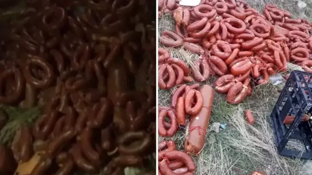 Çok sayıda sucuk, kavurma ve salamın gelişigüzel şekilde atıldığını gören vatandaş, durumu cep telefonuyla kaydederek yetkili kurumlara ihbarda bulundu.