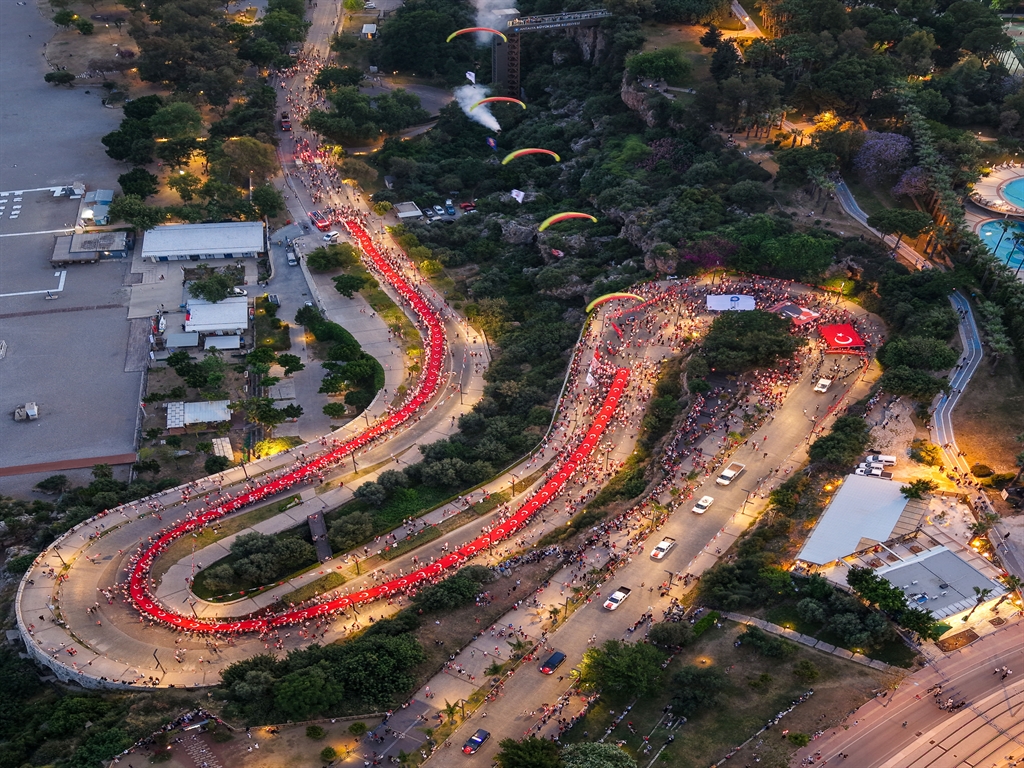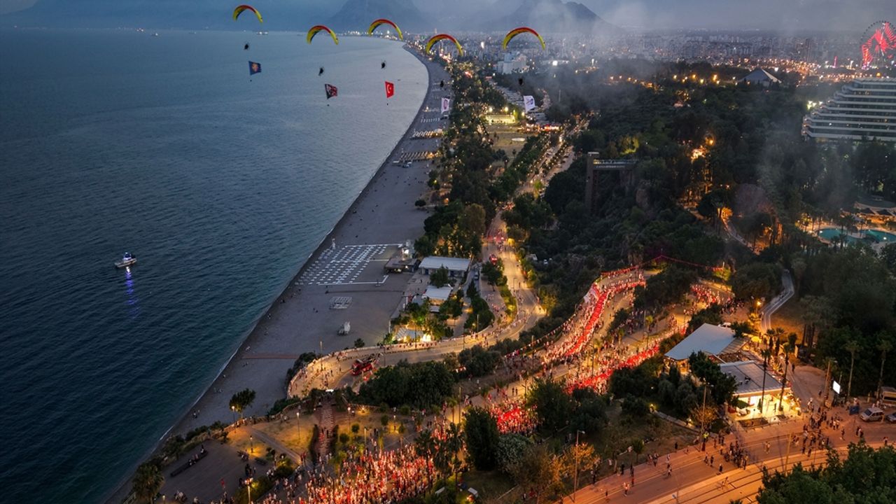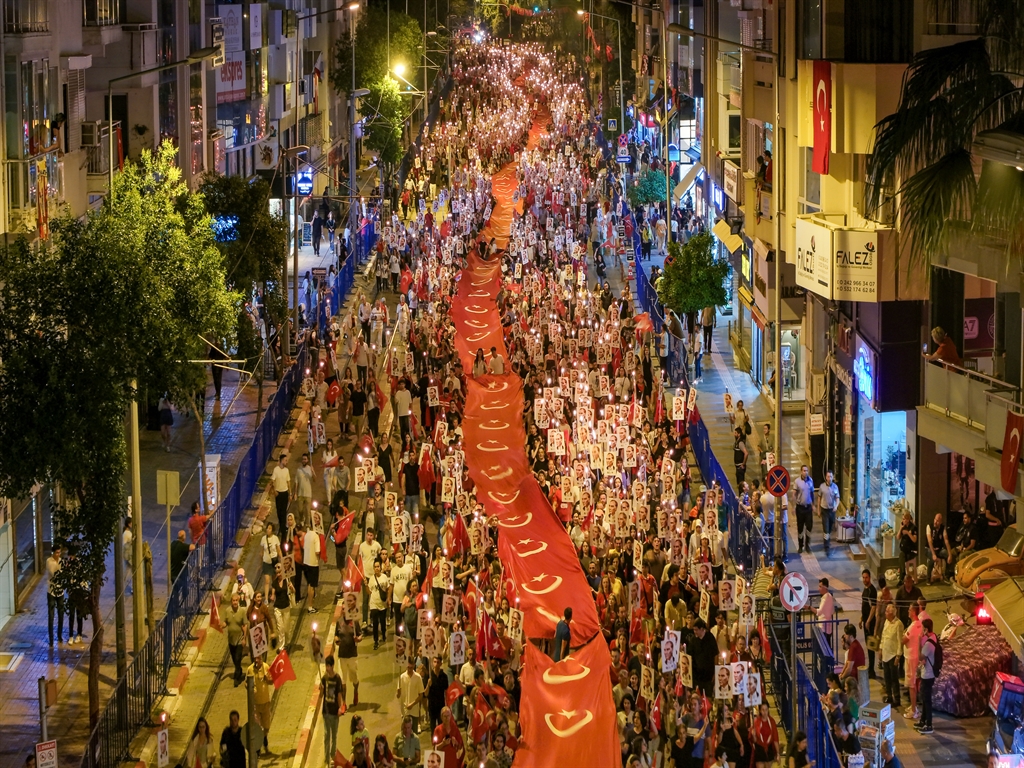Saat 20.00'de Konyaaltı Varyant'tan başlayan fener alayı için katılımcılar saat 18.00'den itibaren alana gelmeye başladı. Toplanan binlerce kişi kortej arasında elden ele tutulan dev Türk bayrağı eşliğinde yürüyüşe başladı. Ayrıca ellerinde bayrak ve meşale taşıyan grup yürüyüş boyunca sloganlar atıp, marşlar söyledi. Kortejde yürüyenler arasında kentte yaşayan yerleşik yabancıların olduğu görülürken, bazı çocuklar ise ebeveynlerinin omuzlarında yürüyüşe katıldı.