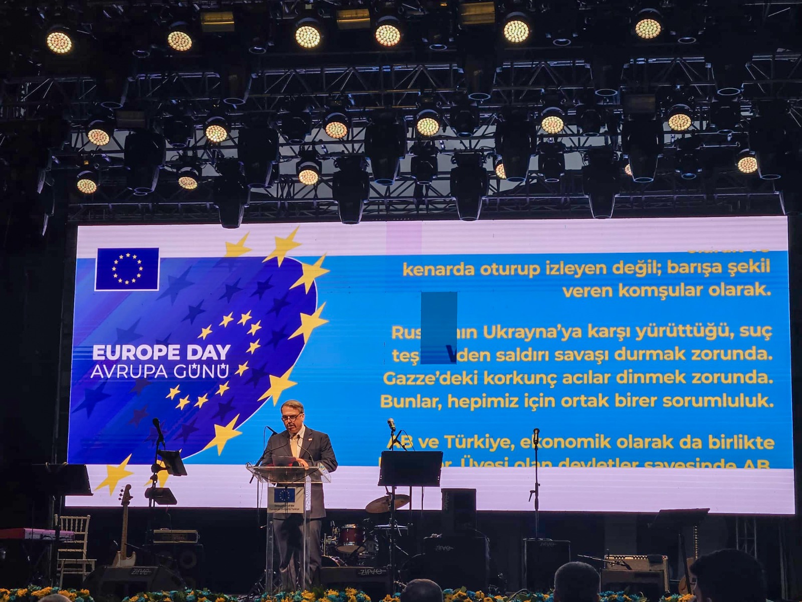 Büyükelçi Ossowski, “75 yıl önce, Avrupa entegrasyonu bir fikirle başladı. Rahatlıktan değil, savaşın yıkımlarından yeni bir şey inşa etme cesaretinden doğan bir fikir. Barışın, ortaklığın, eşit fırsatların olduğu bir Avrupa. Bugün, bu fikri ileriye taşıyoruz, umutla, kararlılıkla ve eylemle. Kolay zamanlardan geçmiyoruz. Ancak 1950'de Avrupa masasının etrafında toplananlar da öyle değildi. İdeal koşulları beklemediler, onları yarattılar. En zor yolun bile birlikte yürünürse, yürünebileceğini gösterdiler. 75 yıl önce, Robert Schuman ve meslektaşları vizyon üzerine kurulu bir gelecek yarattılar ve bunu bize teslim ettiler. Şimdi sıra bizde. Geçtiğimiz yıl, Avrupa ve Türkiye'yi birbirine bağlayan kültürel kökleri kutladık. Restore edilmiş mirastan yeniden canlandırılan hikayelere, paylaşılan hafızadan karşılıklı gurura. Paylaşılan kimliğin bölünmeden daha uzun ömürlü olabileceği fikrini onurlandırdık. Kimliğin bir duvar değil, bir köprü olduğunu hatırladık. Değişen ittifaklar ve artan belirsizlik dünyasında, AB ve Türkiye ortaklığını seçtik. AB ve Türkiye yan yana duruyor. AB'ye aday bir ülke olarak, bir NATO müttefiki olarak ve kenardan seyretmeyen, barışı şekillendiren komşular olarak. Rusya'nın Ukrayna'ya karşı başlattığı suç niteliğindeki saldırganlık savaşı sona ermeli. Gazze'deki korkunç acı sona ermeli. Bu bizim ortak sorumluluğumuz. Ekonomik olarak AB ve Türkiye birlikte büyüyor. Üye devletleri sayesinde AB, Türkiye’nin en büyük ticaret ortağı, en büyük doğrudan yabancı yatırımcısı, finansal iş birliğinde en büyük bağışçısı. Türk vatandaşları, Çin'den hemen sonra en fazla Schengen vizesi alıyor. Ve vizesiz seyahat, Türkiye, mutabık kalınan kıstasları yerine getirdiğinde, tüm aday ülkelerde olduğu gibi gerçekleşebilir. Çünkü daha fazla insan bağı, üniversitelerimizde okuyan daha fazla Türk öğrencisi, enstitülerimizde ve yüksek teknoloji şirketlerinde çalışan daha fazla Türk araştırmacısı istiyoruz. Her gün, değişimlerimizi, ortak projelerimizi ve karşılıklı ilhamımızı güçlendiriyoruz. Türkiye'nin genç beyinleri ve dinamik işletmeleri sadece yarının Avrupa'sı değil, bugünün dokusunun bir parçasıdır. Yollarımız giderek daha fazla iç içe geçiyor. Ancak ilişkilerimizi daha güçlü ve daha iyi hale getirmek için her iki tarafta da daha fazlasını yapmalıyız” ifadelerini kullandı.