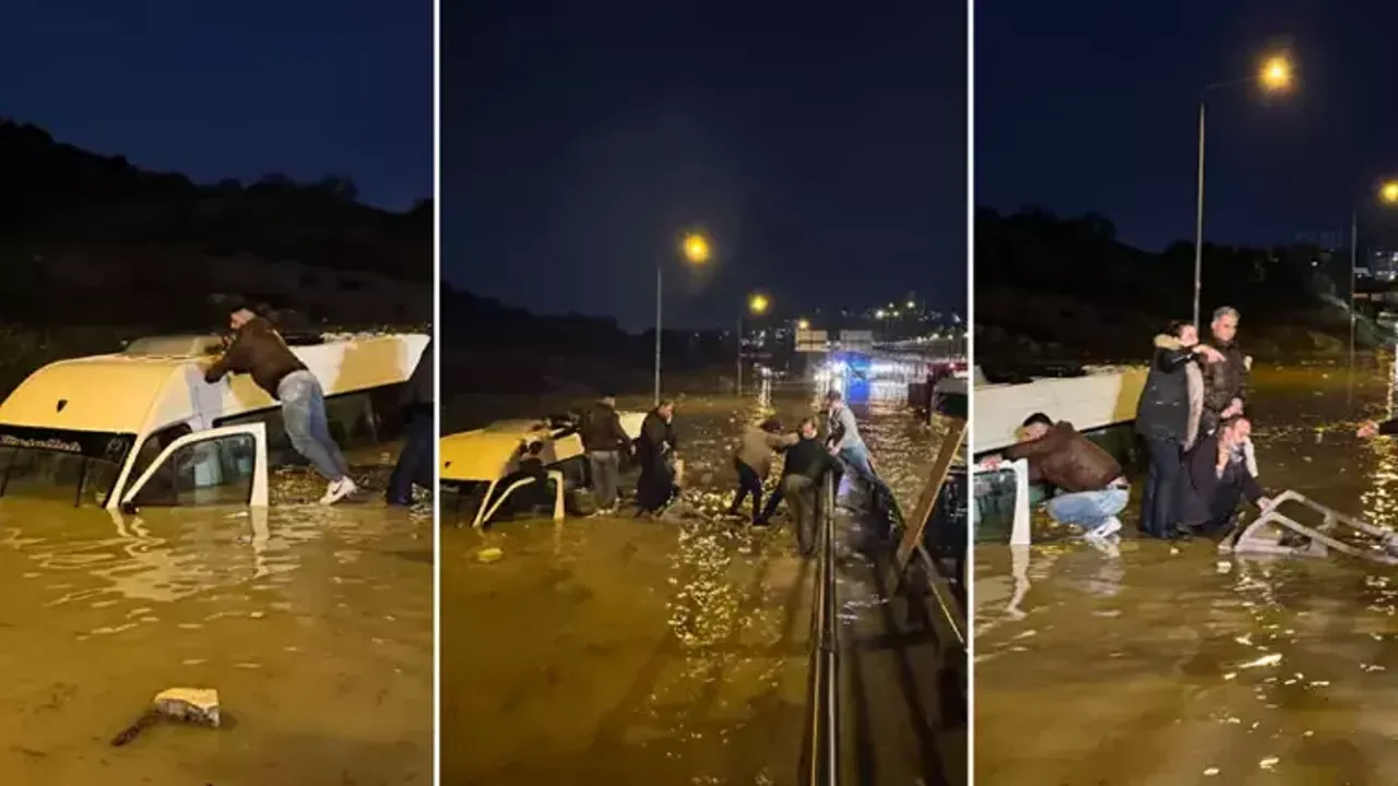 Motoru arızalanan minibüs hareket edemezken bir süre sonra yağmur suyu içeriye dolmaya başladı. Yarısından fazlası suya gömülen ve içerisinde 20 kişinin bulunduğu minibüstekiler 112 Acil Çağrı Merkezini arayarak yardım istedi. Minibüste mahsur kalan yolculara çevredeki vatandaşlar ile olay yeri yakınında bulunan AKUT Kuşadası ekip lideri Tağmaç Saraçoğlu yardım eli uzattı. Yolcular, bir iş yerinden getirilen şezlong ve tahta kapıların yardımıyla yol kenarındaki bariyerlere çıkarıldı.