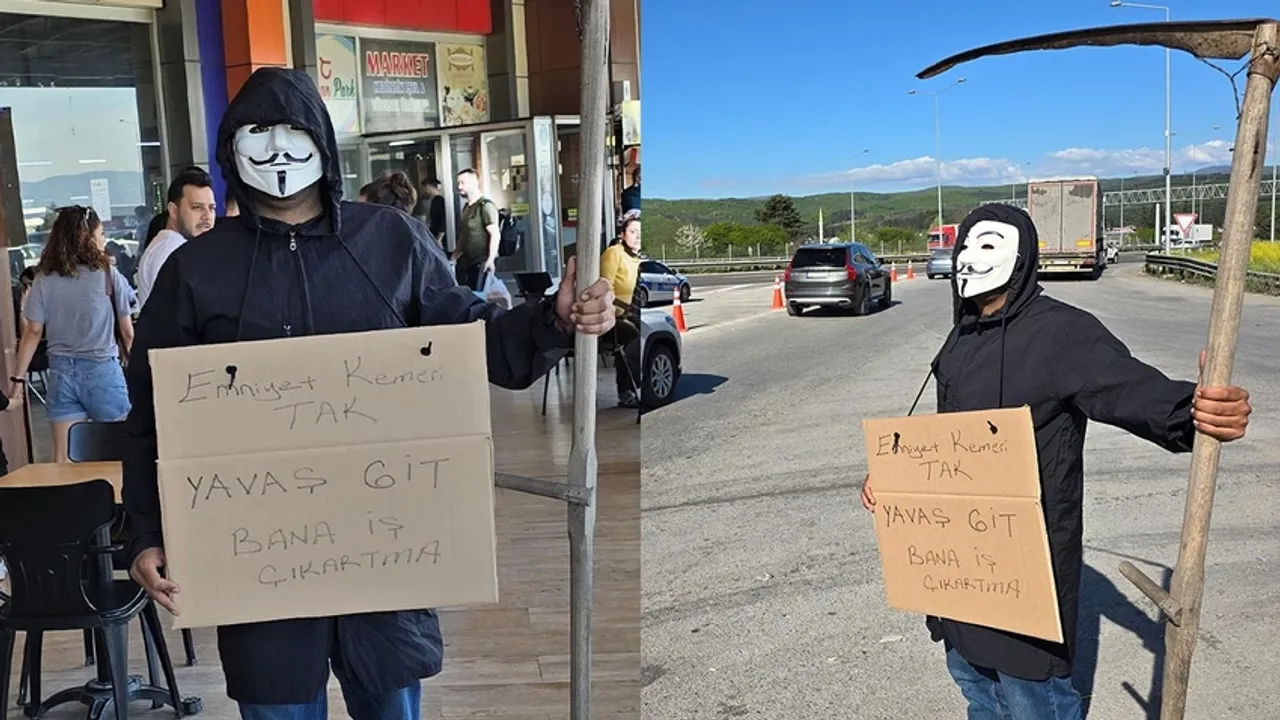 Yüzüne 'Azrail' maskesi takıp, eline de tırpan alan Gür, Anadolu Otoyolu üzerindeki tesislerde dolaştı. Gür, üzerinde 'Emniyet kemeri tak. Hızlı gitme, bana iş çıkarma' yazılı pankartı vatandaşlara okuttu.