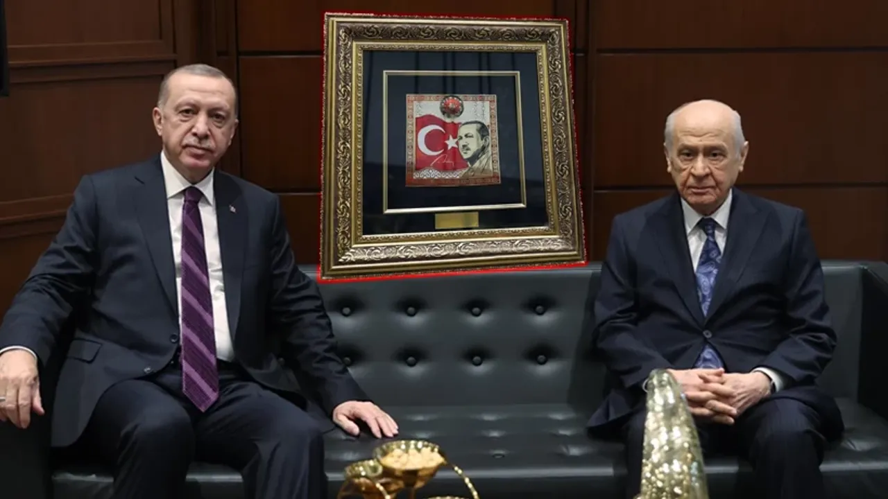 MHP Genel Başkanı Devlet Bahçeli, Cumhuriyetin 102. kuruluş yıl dönümü dolayısıyla Cumhurbaşkanı Recep Tayyip Erdoğan'a, üzerinde resmi, imzası, Türk bayrağı ile Cumhurbaşkanlığı forsunun yer aldığı tablo hediye etti.