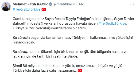 Bakan Kacır, sosyal medya hesabı üzerinden yaptığı açıklamada, "Cumhurbaşkanımız Sayın Recep Tayyip Erdoğan’ın liderliğinde, Sayın Devlet Bahçeli’nin desteği ve kararlı duruşuyla hayata geçen Terörsüz Türkiye, Türkiye Yüzyılı yolculuğumuzda tarihi bir adım. Bu sürecin başarıyla tamamlanması, Türkiye’nin kalkınmasını ve yükselişini hızlandıracak. Bu süreç, sadece ülkemiz için bir kazanım değil, tüm bölgenin huzuru ve istikrarı için de tarihi bir fırsat niteliğinde. Şimdi 86 milyon hep birlikte, tek yürek, omuz omuza, büyük ve güçlü Türkiye için daha fazla çalışma zamanı" ifadelerini kullandı.