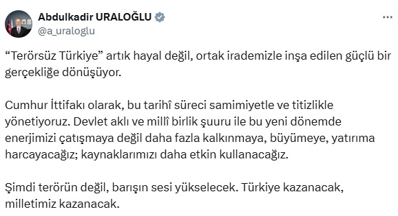 Bakan Uraloğlu, sosyal medya hesabından yaptığı açıklamada, "'Terörsüz Türkiye' artık hayal değil, ortak irademizle inşa edilen güçlü bir gerçekliğe dönüşüyor. Cumhur İttifakı olarak, bu tarihî süreci samimiyetle ve titizlikle yönetiyoruz. Devlet aklı ve millî birlik şuuru ile bu yeni dönemde enerjimizi çatışmaya değil daha fazla kalkınmaya, büyümeye, yatırıma harcayacağız; kaynaklarımızı daha etkin kullanacağız. Şimdi terörün değil, barışın sesi yükselecek. Türkiye kazanacak, milletimiz kazanacak" ifadelerini kullandı.