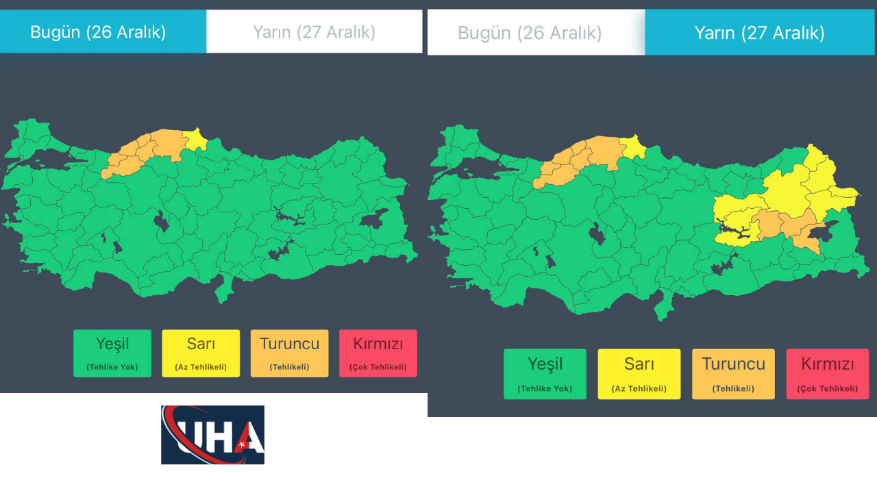 Bakanlığın sanal medya hesabından yapılan açıklamada, "Meteoroloji Genel Müdürlüğü'nden alınan son bilgilere göre; 26 Aralık 2025 Cuma günü gece saatlerinden itibaren Bolu, Düzce, Karabük, Kastamonu'nun kuzeyi, Sinop'un batısı ile Zonguldak ve Bartın illerinin 300 metre rakım üzeri yüksek kesimlerinde kuvvetli ve yer yer yoğun (20 cm üzeri) kar yağışları bekleniyor. 27 Aralık Cumartesi günü, Erzincan, Elazığ, Tunceli, Erzurum, Ardahan ve zamanla Iğdır'ın yüksekleri, Ağrı, Kars ve gece Van'da kuvvetli (5-20 cm), Bingöl, Bitlis, Muş, Hakkari, Şırnak'ın kuzey ve doğusu ile zamanla Van'ın güneyinde yer yer yoğun (20 cm üzeri) kar yağışları bekleniyor. Vatandaşlarımızın ulaşımda aksamalar, buzlanma ve don ile yükseklerde tipi gibi olumsuzluklara karşı dikkatli ve tedbirli olmasını; yetkili mercilerin uyarılarını dikkate almalarını önemle hatırlatıyoruz" denildi