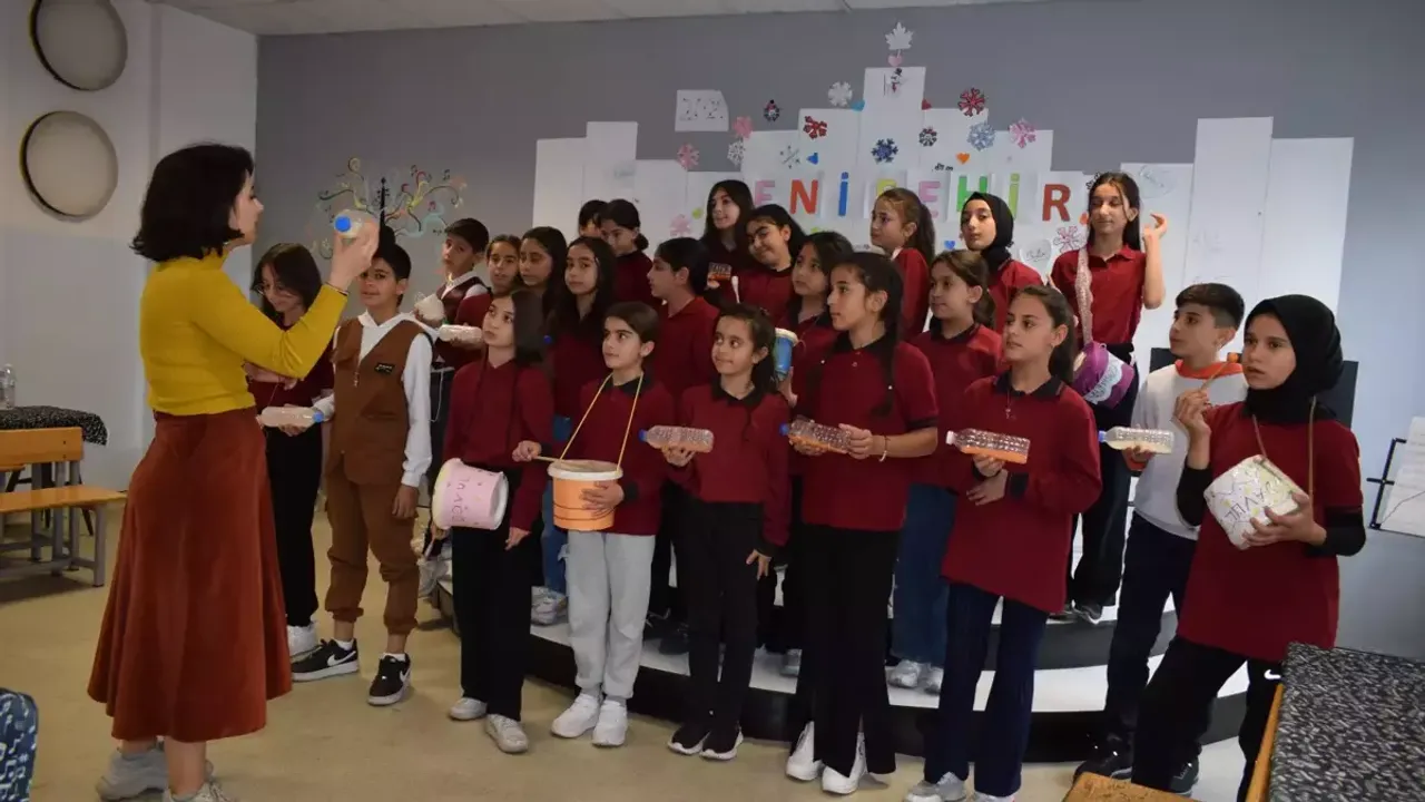Yapılan bu çalışma sayesinde öğrencilerin derslere olan ilgisinin arttığını ifade eden öğretmen Münevver Denizhan, “Projemizin amacı öğrencilerimize geri dönüşüm farkındalığı yaratmaktı. Bunu da öğrenci merkezli bir bakış açısıyla yapmak istedik ve öğrencileri işin içine katmak istedik. Ben müzik öğretmeniyim. Bunun içine müziği de katalım dedim. O yüzden çocuklara atık malzemelerden enstrüman yapmalarını söyledim. Tabi, tamamen gönüllülük esaslı. Öğrencilerden çok hızlı bir şekilde geri dönüşler geldi. Pet şişelerden marakaslar, yoğurt kovalarından davullar, peynir kovaları, helva kutularından hatta borulardan enstrümanlar yapıp getirdiler. Zaten amacımız bunun kullanılabilir olmasıydı. Geri dönüştürmenin amacı da bunu kullanılabilir bir hale getirmekti. Çocuklar enstrümanlarını nasıl kullanacaklarını sordular. Basit ritim kalıplarını öğrettim. Bir şarkı belirledik ve bu şarkıya yaptıkları enstrümanlarla eşlik ettiler. Bu onların öz güvenlerini arttırdı. Projenin sonunda öğrencilere sorular sordum. Bu proje size neler kattı Diye. ‘Hocam ben kendimi keşfettim, hocam benim öz güvenim arttı, hocam aslında benim çöp olarak gördüğüm şeylerin çöp olmadığını gördüm’ diye çok güzel cümlelerle karşılaştım. Bunun yanında müzik dersine ilgilerinin arttığını da gördük. Çocuklar derslere çok daha ilgili bir şekilde geliyorlar. Güzel dönüşler aldık. Sınıfça yaptık ve çocuklar birbirleriyle dayanışma halinde yaptılar bunu. Birliktelik ruhları gelişti. Hem kendilerini keşfettiler hem de eğlenerek öğrendiler. Başka şeylerde isteyeceğim onlardan. Tablolar, eşyalar, enstrümanların dışında aletler, kullanılabilir araçlar ve gereçler isteyeceğim. Bakalım neler göreceğiz. Çocuklar geri dönüşümün önemini bu şekilde keşfettiler. Yaşayarak öğrendiler. Çocuklar artık bu sahneyi daha öz güvenli bir şekilde kullanabiliyorlar dedi.