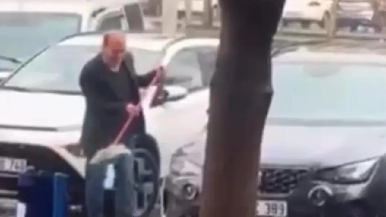Yağmurun etkisiyle sokakların boşaldığı sırada aracını kenara çeken sürücünün, elindeki fırça ve köpükle aracını detaylı şekilde temizlemesi ilginç görüntüler oluşturdu.