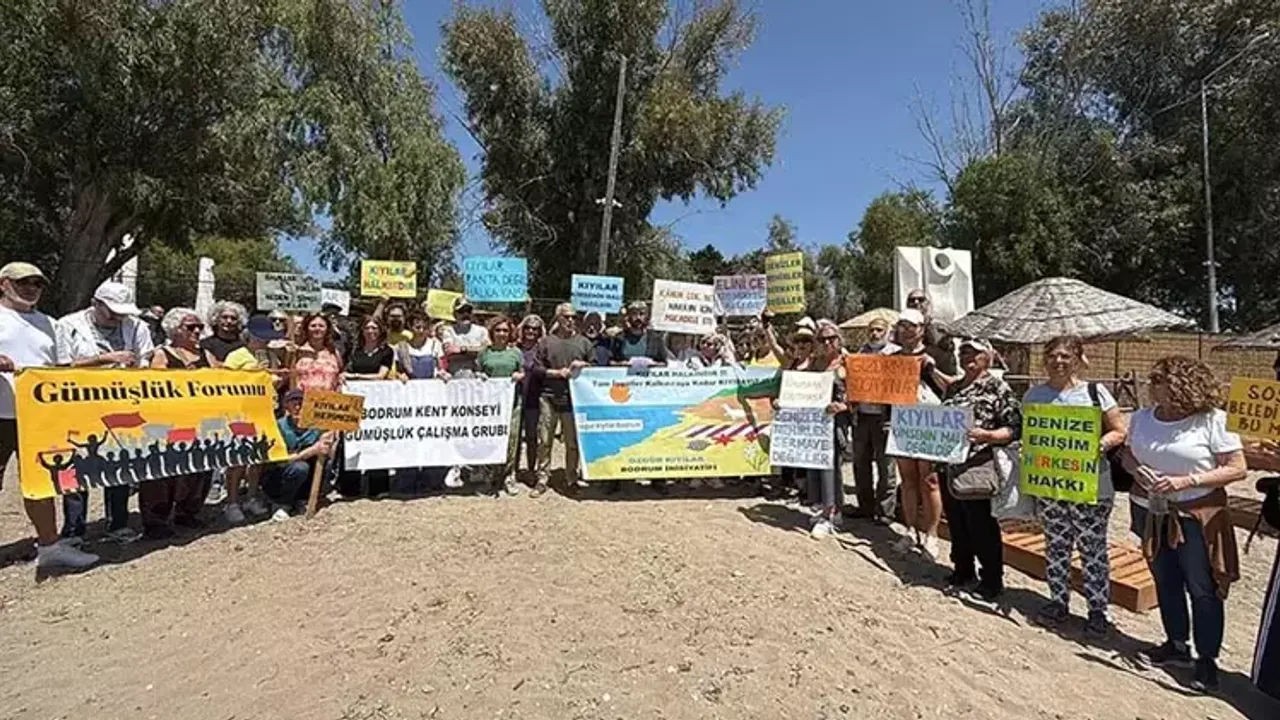Özgür Kıyılar Bodrum İnisiyatifi ve Gümüşlük Forumu ile bir grup, Gümüşlük Mahallesi'ndeki halk plajına bir işletme tarafından önceki gün şezlong konularak hukuksuz yere işgal edildiği gerekçesiyle bir araya geldi. Grup, 'Elini çek kıyı herkesin hakkıdır', 'Kıyılar kimsenin malı değildir', 'Kıyılar halkındır', 'Kanun çok net hakkın için mücadele et', 'Kıyılar halkındır engellenemez', yazılı dövizler taşıdı. İşletmenin ise dün 'Şezlonglar ücretsizdir', 'Şezlonglar halkın kullanımına açıktır' yazılı kağıt astığı belirtildi.