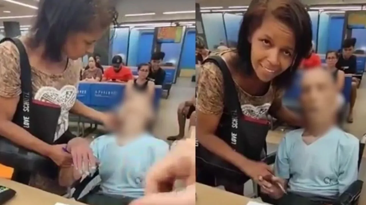 Adı Erika de Souza Vieira Nunes olduğu öğrenilen kadın, sandalyede oturan yaşlı bir adamın yanında dururken adamın kafasını dik tutmaya çalıştı.