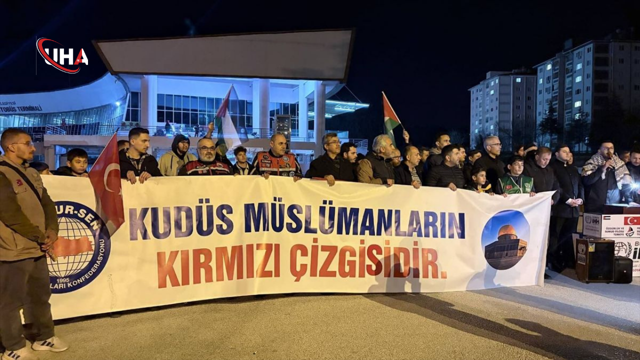 Atatürk Mahallesi'nde bir araya gelen gönüllülerin yatsı namazını Burkent Camisi'nde kıldıktan sonra oluşturdukları konvoy Emek Mahallesi, Bülent Ecevit Bulvarı, Gazi Caddesi, Armağan İlci Bulvarı ve İnönü Caddesi'ni takiben otogarda sona erdi. Burada açıklama yapan Filistin Destek Platformu Sözcüsü Hüseyin Büyükkeleş, "Gözü dönmüş, azgın bir grup Siyonist tarafından planlanmış ve ne yazık ki uygulamaya konulmuş, akıl almaz bir dönemi yaşamaktayız. Tüm değerlerin yok sayıldığı, çiğnendiği bir zaman diliminden geçmekteyiz. İnsanlık adeta azgın ve sapkın bir ideoloji tarafından ne yazık ki rehin alınmıştır. Biz esir değiliz. Bu esaret girişimine karşı kayıtsız kalacakta değiliz. Siyonist rejim şunu bilsin ki zalimlerin topuna canımızla başımızla, elimizle, aşımızla, varımızla, yoğumuzla direneceğiz. Bugün burada sadece bir kınama mesajı yayınlamak için değil insanlığın ortak mirasına, inanç özgürlüğüne ve uluslararası hukukun temel taşlarına vurulan baltayı deşifre etmek için toplandık. İslam dünyasının kalbi kanıyor, ilk kıblemize zincirler vuruluyor ve modern dünya, tarihin en büyük 'inanç ve yaşam hakkı' ihlaline, küresel bir şantaj sarmalının gölgesinde seyirci kalıyor. Siyonist İsrail rejimi tarafından, Gazze'de işlenen soykırımın kahredici acısı vicdanlarda canlı dururken, Lübnan'da ve İran'da ortaya konan yeni vahşetler insanlığı bir kez daha derinden sarsmaktadır. 165 İranlı öğrencinin, Siyonist rejim tarafından okul sıralarında katledilmesi ve bu katliamın küresel vicdanda yeteri kadar yer bulmaması bizleri derinden sarssa da bugün burada olduğu gibi dünyanın dört bir yanından yükselen itiraz sesleri bir nebze olsun umudumuzu yeşertmektedir" diye konuştu.