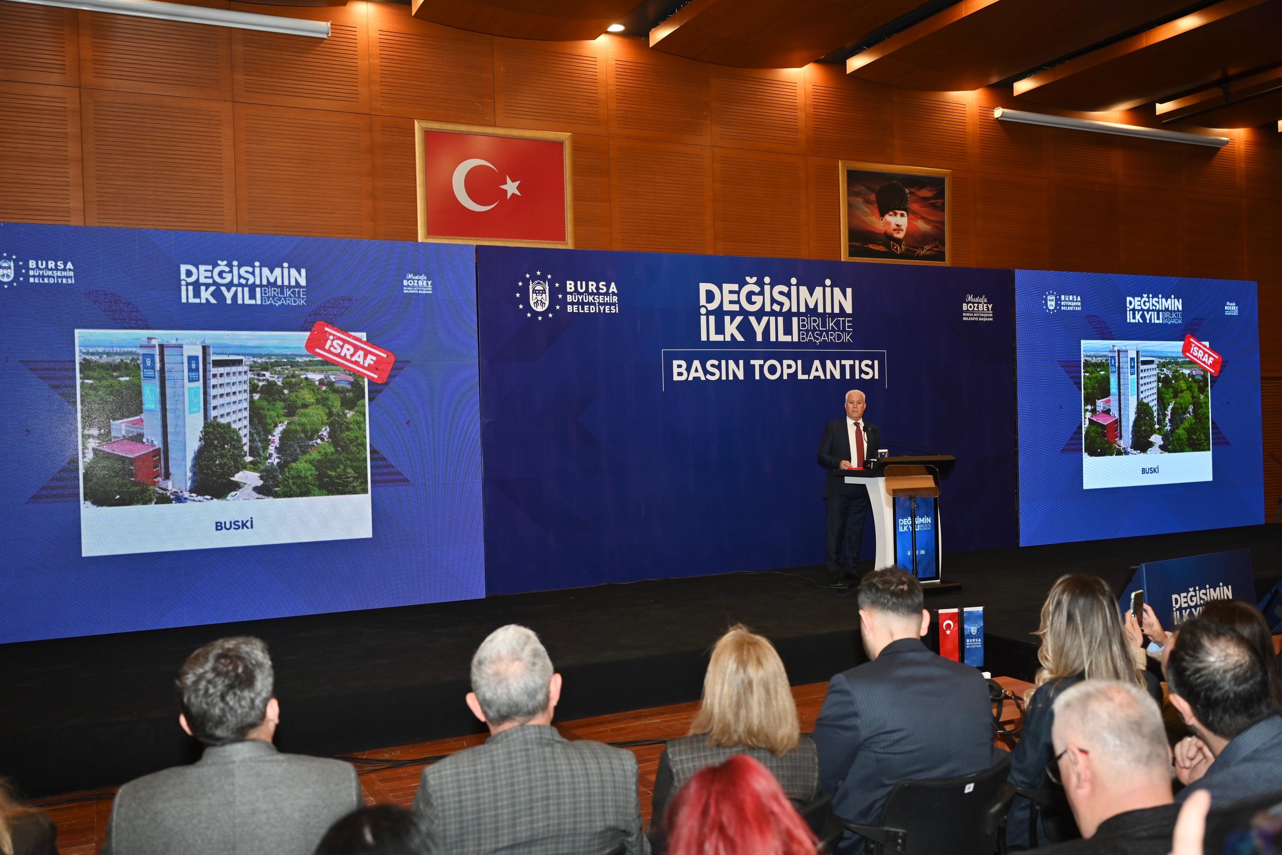 BUSKİ'nin ciddi bir tahribatla karşı karşıya bırakıldığını belirten Bozbey, "BUSKİ, 9 iştirakin içerisinde BURULAŞ ile beraber en kötü pozisyondadır. Yargıya taşınmış belediyeler içerisinde en büyük yolsuzluğun olduğu kurumdur. Bunu yargıya biz taşıdık. Üstü örtülmüş, ilgililer hakkında karar alınmamış. Sadece 3-4 kişi tutuklanmış. Müfettiş raporları niye uygulamaya geçmemiş? 600’ün üzerinde kişi bu konuyla yargılanıyor. Bütün bunlar, kurumu mali ve kurumsal açıdan derin bir krizin eşiğine getirmiştir. Bizler, bu değerli kurumumuzu yeniden ayağa kaldırmak, halkımıza hesap veren, şeffaf ve sürdürülebilir bir yapıyı inşa etmek için kararlılıkla çalışıyoruz. Döviz üzerinden gereksiz harcamalarla BUSKİ’nin bütçesi ciddi şekilde dengesiz hale getirilmiş. BUSKİ’nin dış borcu 359 milyon 500 bin euro. Biz göreve geldiğimizde 8.1 milyar lira olan borcu, dövizin artmasıyla bir yılda 14.7 milyar liraya çıktı. Muhtemelen bu yılın sonunda BUSKİ’nun borcu yaklaşık 25 milyar liraya çıkacak” dedi.