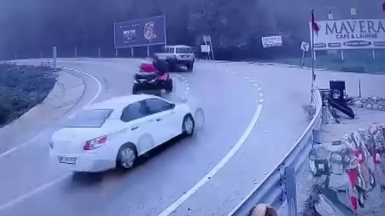 Osmangazi ilçesi İnkaya mevkii Uludağ yolunda, yağmur nedeniyle kayganlaşan yolda, virajı alamayan sürücülerin otomobilleriyle yaptığı kazalar çevredeki bir iş yerinin güvenlik kamerasına yansıdı. Görüntülerde, Uludağ Oteller Bölgesi’nden kent merkezine ATV ile seyir halinde olan sürücü, yokuş aşağı virajı alamayınca, karşı yönden gelen otomobile çarptı. Aynı noktadan kameraya yansıyan bir başka görüntüde ise yokuş aşağı inen otomobilin çarptığı başka bir otomobilin bariyere çarptığı görüldü. Aynı noktada 2 otomobilin daha bariyerlere çarptığı görüntülere yansıdı. (DHA)
