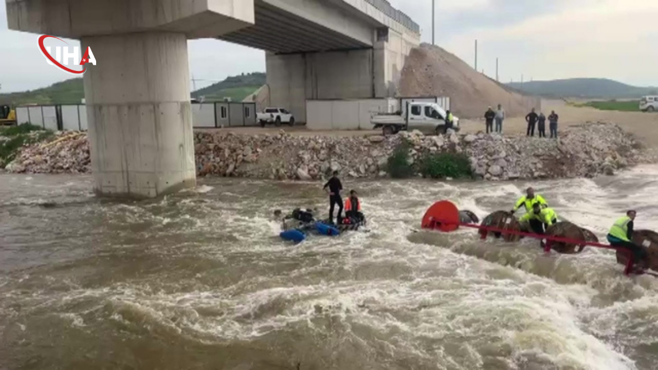 Olay, saat 17.00 sıralarında İnegöl ilçesi Ebeköy ile Papatya mahalleleri arasından geçen Kocasu Deresi’nde meydana geldi. İddiaya göre, hızlı tren hattının elektrik işlerini yapan işçilerin bulunduğu traktör, dereden karşı tarafa geçmek istedi. Akıntının etkisiyle traktör devrilirken, işçiler derede mahsur kaldı. İhbar üzerine olay yerine çok sayıda itfaiye, jandarma, AFAD ve arama kurtarma ekipleri sevk edildi. Ekiplerin kontrollü bir şekilde çalışması sonucu deredeki işçiler, vinç yardımıyla kısa sürede dereden çıkarılarak güvenli alana taşındı. İşçilerin kurtarılma anları cep telefonu kamerasına yansırken, durumlarının iyi olduğu öğrenildi.
