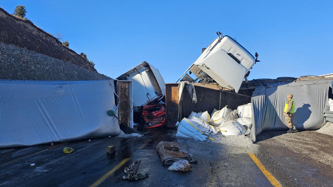 Yolun buzlanması nedeniyle aynı istikamette ilerleyen tuz ve saman yüklü 2 TIR ile 1 otomobil çarpıştı. İhbar üzerine bölgeye AFAD, Jandarma ve sağlık ekipleri sevk edildi. AFAD ekibi, 2 TIR’ın arasında kalıp hurdaya dönen otomobilin sürücüsünü çıkararak sağlık ekiplerine teslim etti. İlk müdahalesi yapılan sürücü hastaneye kaldırıldı. Kaza sebebiyle kara yolunda ulaşım kontrollü olarak sürdürülüyor.