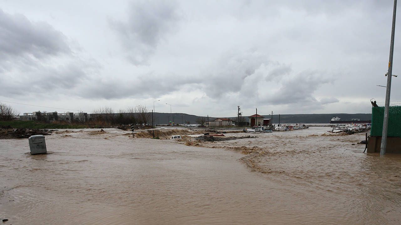 Güçlü su akışıyla birlikte taşan çay balıkçı barınağına doğru ilerledi. Burada bulunan bazı tekneler taşkından zarar görürken mal sahipleri teknelerinin halatlarını güçlendirdi.