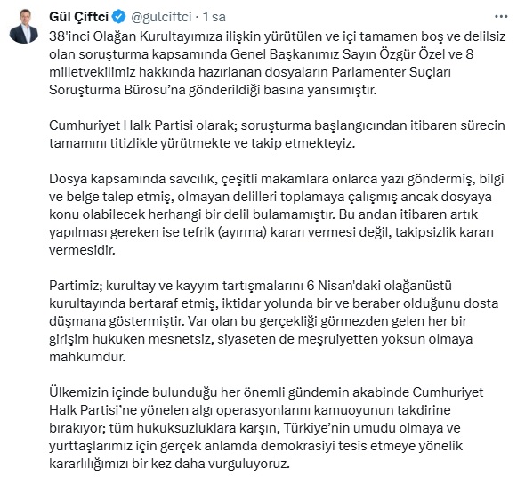 CHP Genel Başkan Yardımcısı Gül Çiftçi, sosyal medya hesabı üzerinden yaptığı açıklamada, "38'inci Olağan Kurultayımıza ilişkin yürütülen ve içi tamamen boş ve delilsiz olan soruşturma kapsamında Genel Başkanımız Sayın Özgür Özel ve 8 milletvekilimiz hakkında hazırlanan dosyaların Parlamenter Suçları Soruşturma Bürosu’na gönderildiği basına yansımıştır. Cumhuriyet Halk Partisi olarak; soruşturma başlangıcından itibaren sürecin tamamını titizlikle yürütmekte ve takip etmekteyiz. Dosya kapsamında savcılık, çeşitli makamlara onlarca yazı göndermiş, bilgi ve belge talep etmiş, olmayan delilleri toplamaya çalışmış ancak dosyaya konu olabilecek herhangi bir delil bulamamıştır. Bu andan itibaren artık yapılması gereken ise tefrik (ayırma) kararı vermesi değil, takipsizlik kararı vermesidir. Partimiz; kurultay ve kayyım tartışmalarını 6 Nisan'daki olağanüstü kurultayında bertaraf etmiş, iktidar yolunda bir ve beraber olduğunu dosta düşmana göstermiştir. Var olan bu gerçekliği görmezden gelen her bir girişim hukuken mesnetsiz, siyaseten de meşruiyetten yoksun olmaya mahkumdur. Ülkemizin içinde bulunduğu her önemli gündemin akabinde Cumhuriyet Halk Partisi’ne yönelen algı operasyonlarını kamuoyunun takdirine bırakıyor; tüm hukuksuzluklara karşın, Türkiye’nin umudu olmaya ve yurttaşlarımız için gerçek anlamda demokrasiyi tesis etmeye yönelik kararlılığımızı bir kez daha vurguluyoruz" ifadelerini kullandı.