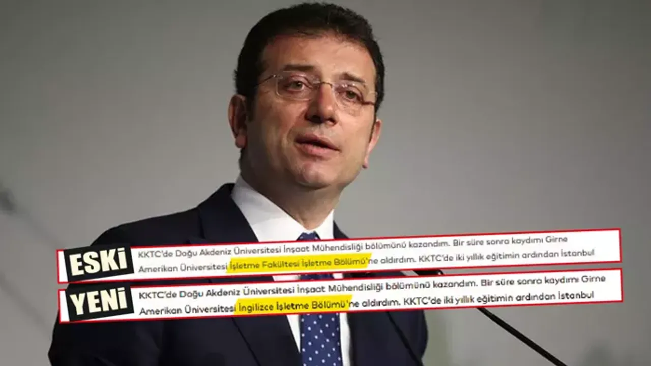 İmamoğlu'nun resmi sitesinde 'Eğitim Hayatım' bölümünde daha önce, "KKTC'de Doğu Akdeniz Üniversitesi İnşaat Mühendisliği bölümünü kazandım. Bir süre sonra kaydımı Girne Amerikan Üniversitesi İletişim Fakültesi İşletme Bölümü'ne aldırdım" kısmını "KKTC'de Doğu Akdeniz Üniversitesi İnşaat Mühendisliği bölümünü kazandım. Bir süre sonra kaydımı Girne Amerikan Üniversitesi İngilizce İşletme Bölümü'ne aldırdım" şeklinde değiştirdiği görüldü.