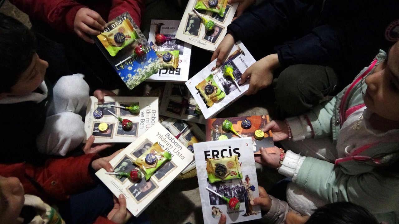 Erciş ilçesi Camikebir Mahallesi’nde yaşayan, oto yedek parça satarak geçimini sağlayan ve aynı zamanda özgün tablo sanatçısı olan 3 çocuk babası Sami Demir, bayramda çocuklara sürpriz yaptı. Demir, kapısını çalan çocuklara sepette kitap kapaklarının üzerine yapıştırılmış şeker ve çikolataları ikram ederek, “Bugün bayramda gezen çocuklara güzel bir sürpriz yaptım. Kendi yazdığım kitaplara şeker ve çikolata yapıştırarak gelen çocuklara verdim. Amacım farkındalık oluşturmaktı. Çocuklar önce şaşırdı, sonra çok mutlu oldu. Umarım kitap okumalarına katkım olur” diye konuştu.