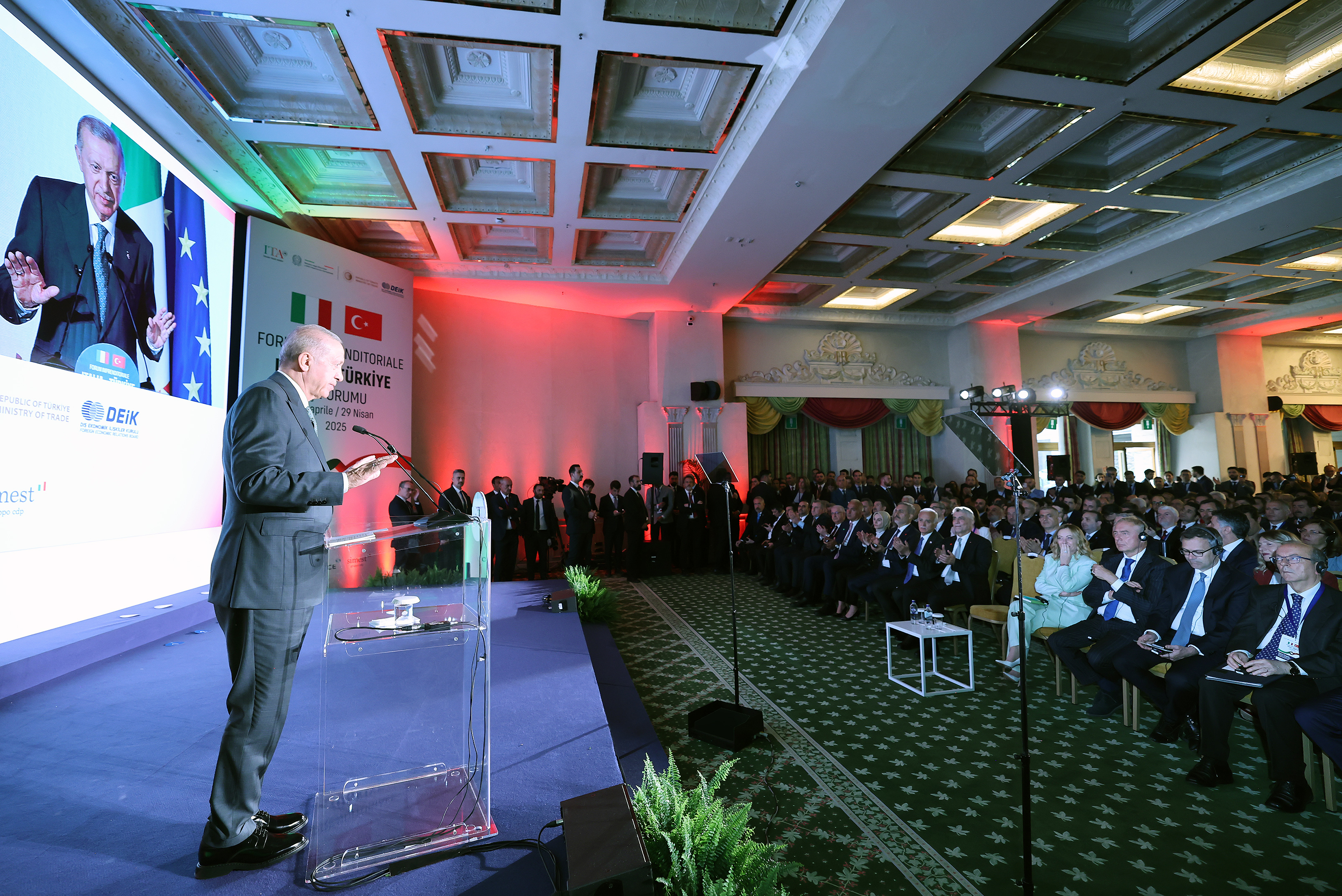 "Bugün Türkiye'deki İtalyan sermayesi dolaylı yollardan gelenlerle birlikte 5 milyar dolara, İtalya'daki Türk sermayesi ise son yıllarda önemli atılım göstererek 1 milyar dolara yaklaştı. Türk firmaları nasıl İtalya'yı Avrupa pazarına açılan bir kapı olarak görüyorsa, biz isteriz ki İtalyan firmaları da Türkiye'yi Asya'ya, Orta Doğu'ya ve Afrika'ya açılan bir kapı olarak değerlendirsinler. İstanbul'dan sadece birkaç saatlik uçuş mesafesinde 2 milyar nüfusa erişilebiliyor. Türk Hava Yollarımız da İtalya'nın 9 şehrini İstanbul'a bağlıyor. Ticaret, yatırım ve ulaşım imkânlarının barındırdığı bu muazzam potansiyel, bizleri büyük ve iddialı hedefler belirlemeye teşvik ediyor. Bu düşünceyle bugünkü zirvede Sayın Meloni ile yeni ticaret hacmi hedefimizi 40 milyar dolar olarak tespit ettik. İş çevrelerimizin bugünkü görüşmeleri ve kuracakları yeni ortaklıklar kısa sürede yeni ticaret hedefimize ulaşılmasına katkı sağlayacaktır. Tabii karşılıklı yatırımların artırılması da bir diğer öncelikli hedefimiz olmayı sürdürüyor.”