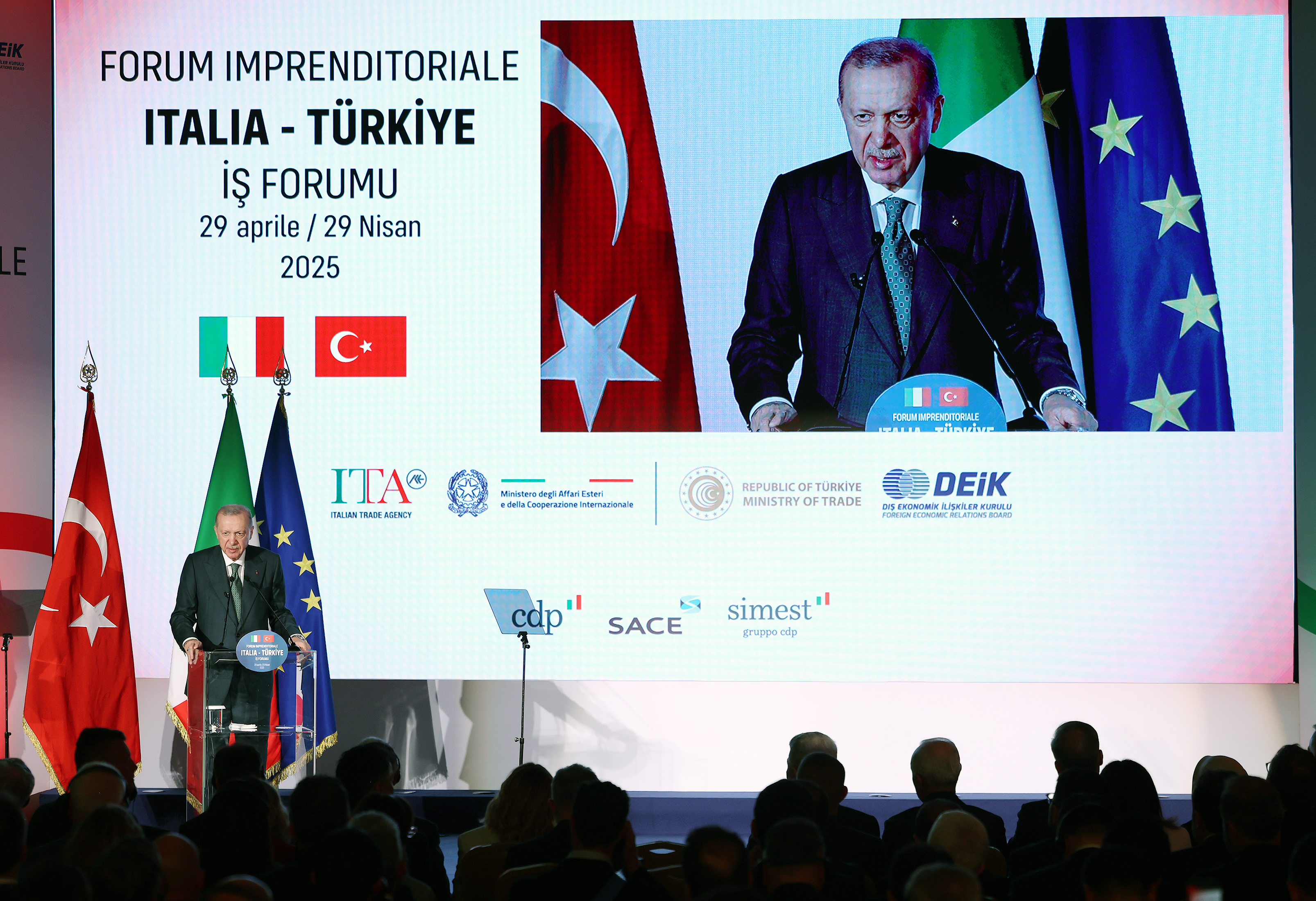 Cumhurbaşkanı Recep Tayyip Erdoğan, İtalya’nın başkenti Roma’da Ticaret Bakanlığı, Dış Ekonomik İlişkiler Kurulu (DEİK), İtalya Dışişleri Bakanlığı ve İtalyan Ticaret Ajansı tarafından düzenlenen Türkiye-İtalya İş Forumu'na katıldı. Burada yaptığı konuşmada, İtalya Başbakanı Meloni'ye misafirperverliği için teşekkür etti. Cumhurbaşkanı Erdoğan, birincisini 2008'de Türkiye'de icra ettikleri hükümetlerarası zirve mekanizmasının aradan geçen sürede ülkeler arasındaki çok boyutlu siyasi ilişkilerin yanı sıra ekonomide de önemli ilerleme kaydedilmesine katkı sağladığını belirtti. İş insanlarının girişimlerinin bu başarıda büyük rolü olduğunu vurgulayan Cumhurbaşkanı Erdoğan, gelecek dönemde bu ortaklığın daha ileri seviyelere taşınacağına gönülden inandıklarını söyledi.