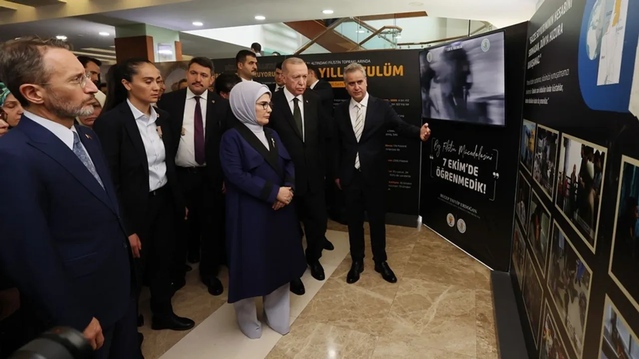 Başkan Erdoğan, açıklamasına şöyle devam etti: Vicdan yoksunu 3-5 Siyonist işbirlikçi Filistin konusundaki milli mutabakatı bozmaya çalışsalar da başaramadılar. İnşallah bundan sonra da başaramayacaklar. İsrail'in 76 yıllık işgal ve katliam politikalarını gösteren bu utanç verici sergiyi birazdan hep birlikte gezeceğiz. Sizlerin de görmesini tavsiye ediyorum.