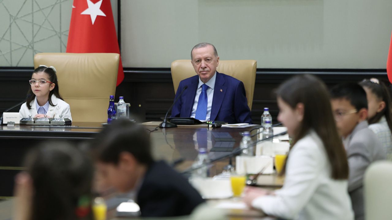 Cumhurbaşkanı Recep Tayyip Erdoğan, 23 Nisan Ulusal Egemenlik ve Çocuk Bayramı dolayısıyla Cumhurbaşkanlığı Külliyesi'nde Milli Eğitim Bakanı Yusuf Tekin ve beraberindeki çocukları kabul etti.